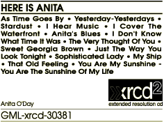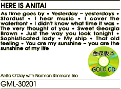 『爵士女聲的魅力 』 爵士女歌手 Anita O'Day 歌聲迷人,功力深厚,演唱爵士名曲令人百聽不厭,日本發燒唱片公司 GML 特別將她 1976 在日本東京六本目演出的現場錄音翻製成金 CD,不但聲歌靚,而且現場氣氛佳絕,任何一首名曲皆能帶你進入爵士的迷人境界。 |